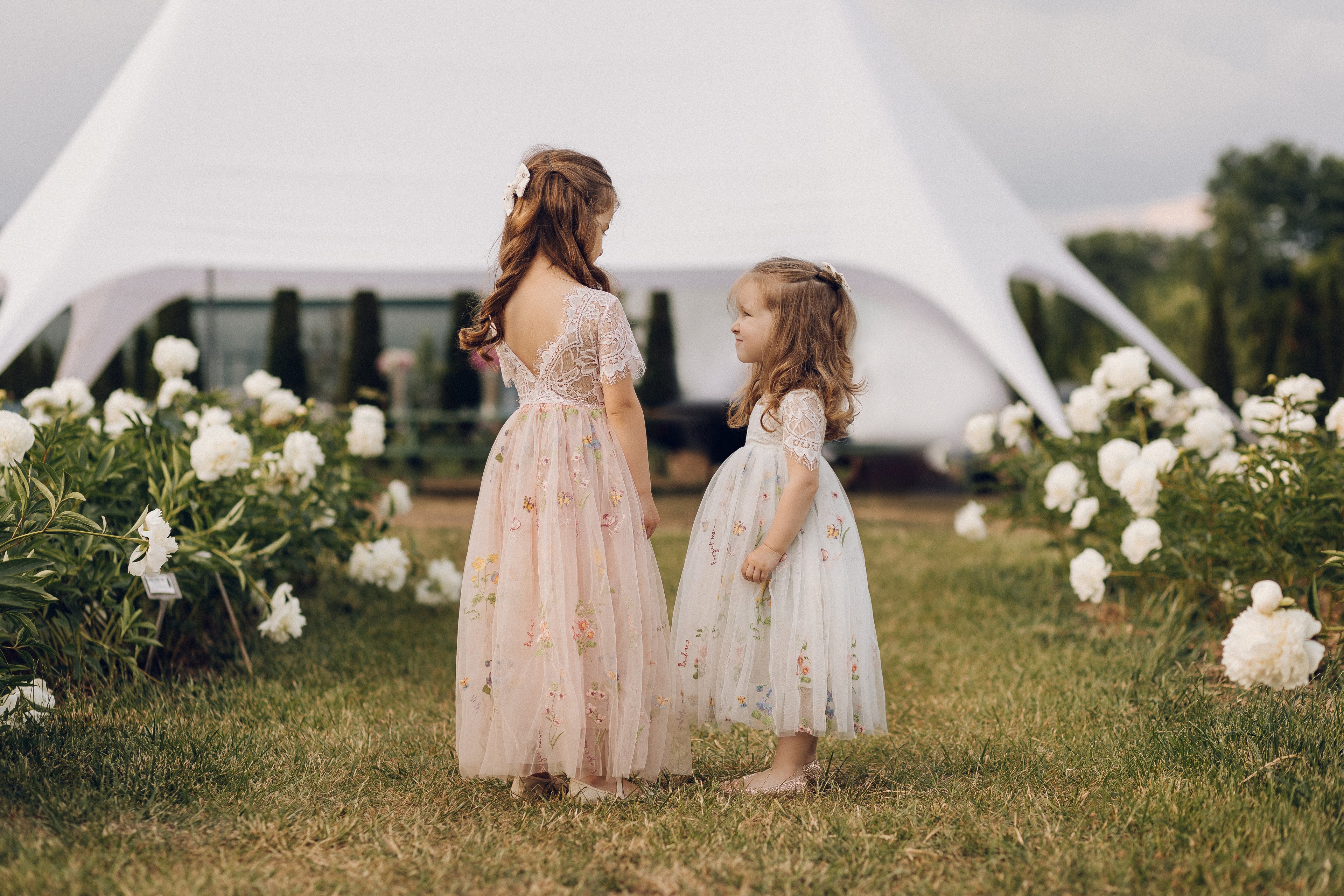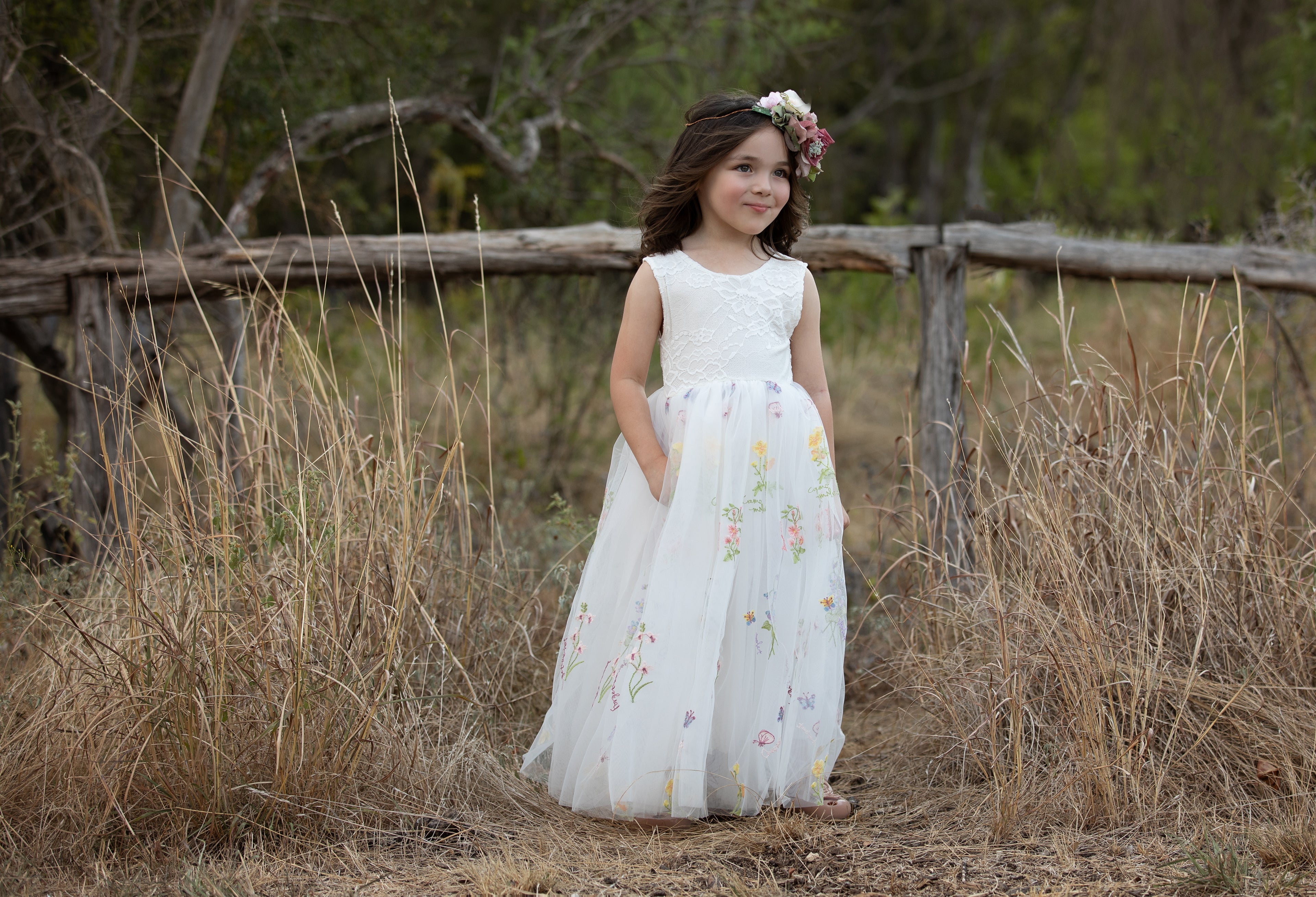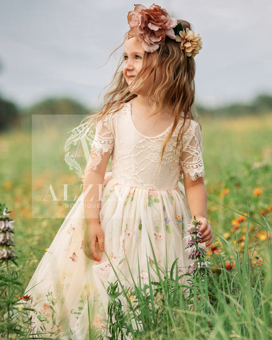 Champagne Floral Embroidered Tulle Dress – Full Length, Short Sleeves | Wildflowers Collection