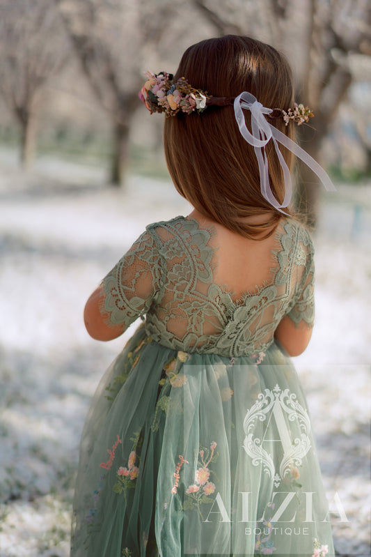 Sage Green Floral Embroidered Tulle Dress-Wildflowers Collection