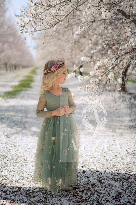 Sage Green Floral Embroidered Tulle Dress – Long Sleeve, Full Length | Wildflowers Collection