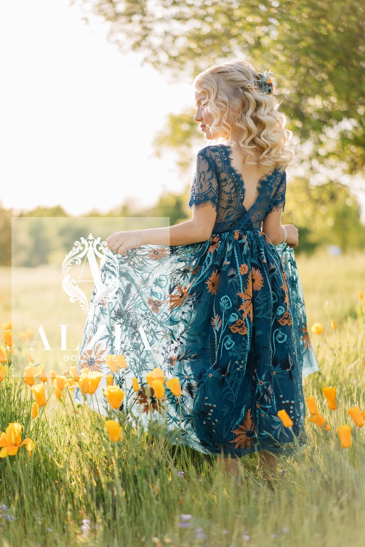 A bold teal hue meets whimsical wildflower embroidery — made for magical moments and twirls that tell a story.