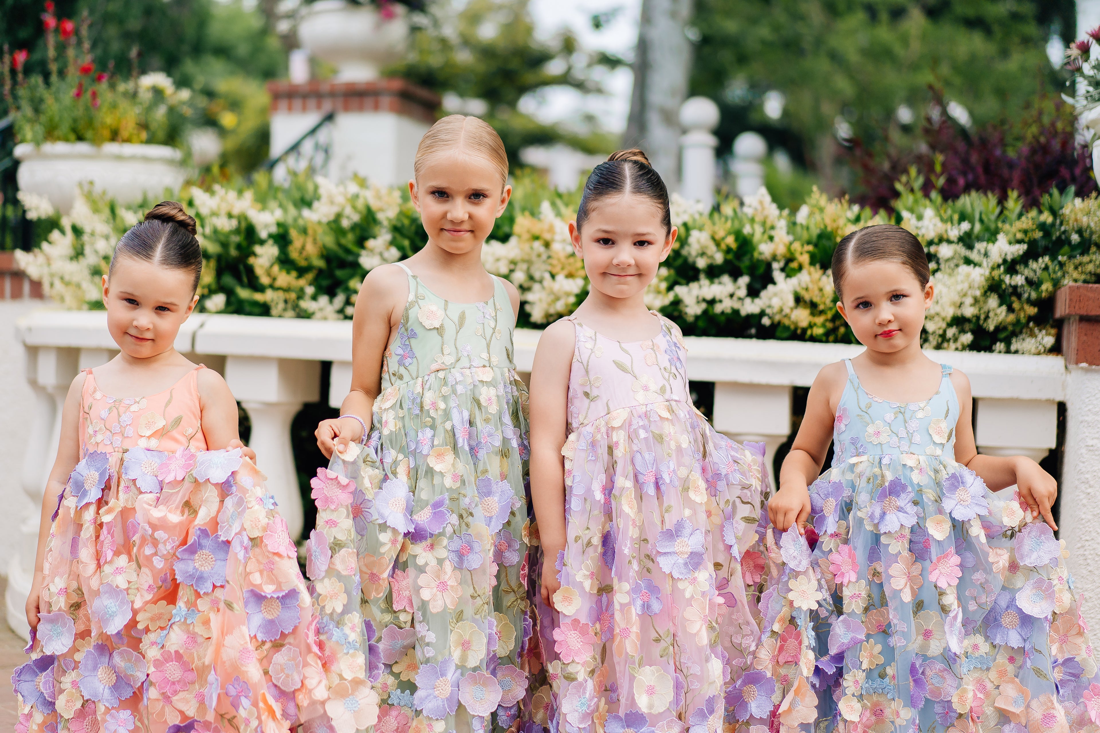 This mint green tulle gown features hand-applied 3D floral appliqués in delicate pastel shades, a velvet smocked bodice, and adjustable straps for the perfect fit.